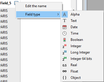 You can also change the name and data type for the new fields by clicking on the field’s title bar in the Preview Area: a pop-up menu displays the different types available: