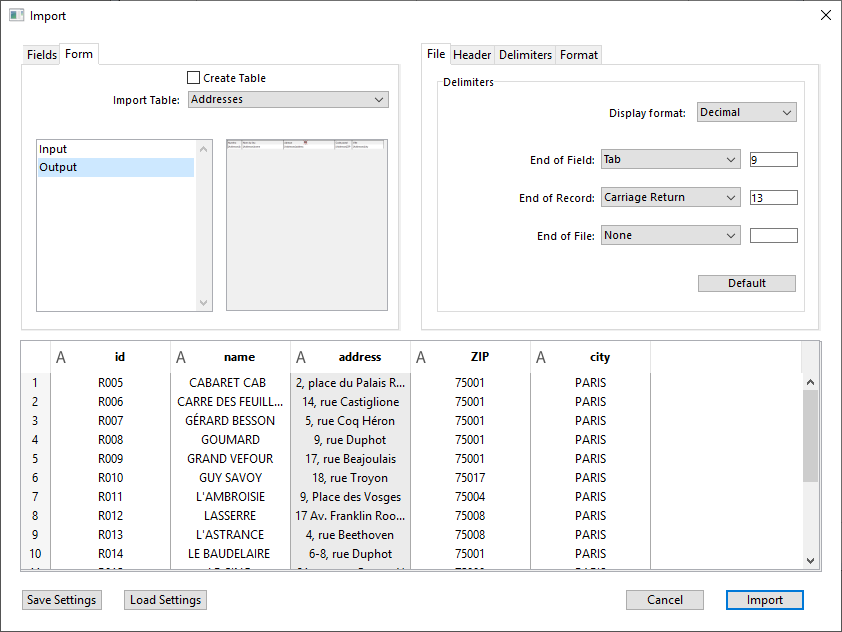 In the Design environment, you import data by the intermediary of the Import dialog box. In the Application environment, you can also display this dialog box (IMPORT DATA command) or directly import files via the commands of the Import and Export theme.