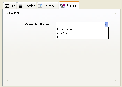 The syntax to use is True_Value;False_Value. For example, if you import a column into a Boolean field whose values are “Black” (for true) and “White” (for false), you can enter Black;White. The combo-box displays the most commonly used Boolean formats. You can enter any format that is not in the combo-box.