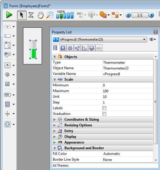 Adiciona uma barra de progresso vertical associada a uma variável número cujos valores pré-determinados min e max são 0 e 100. Pode modificar estes valores utilizando a lista de propriedades.