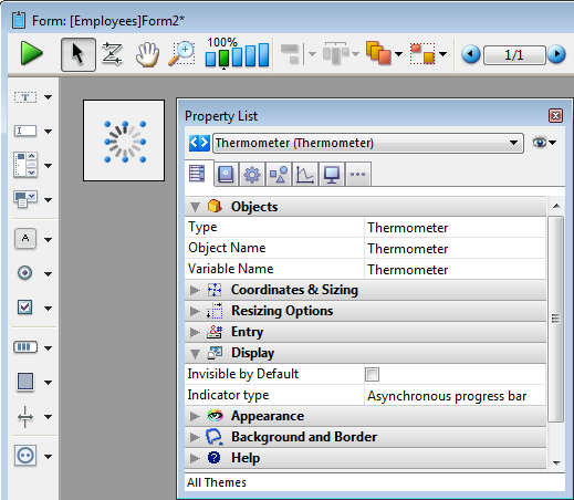 Adiciona uma barra de progresso horizontal associada a uma variável número cujos valores min e max pré-determinados são 0 e 100. Pode modificar estes valores utilizando a lista de propriedades.