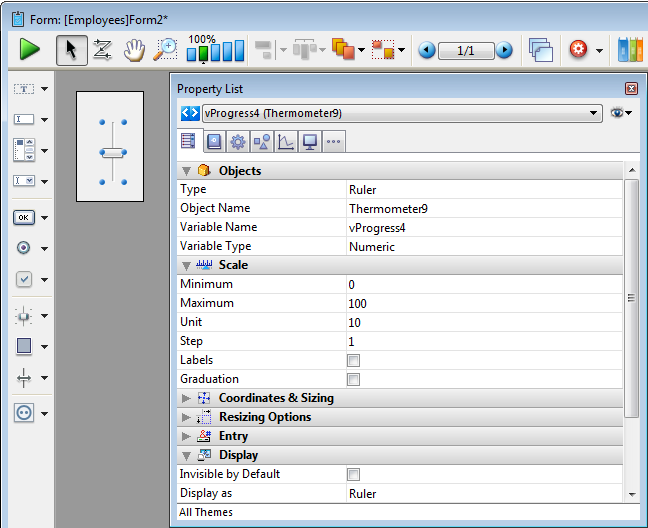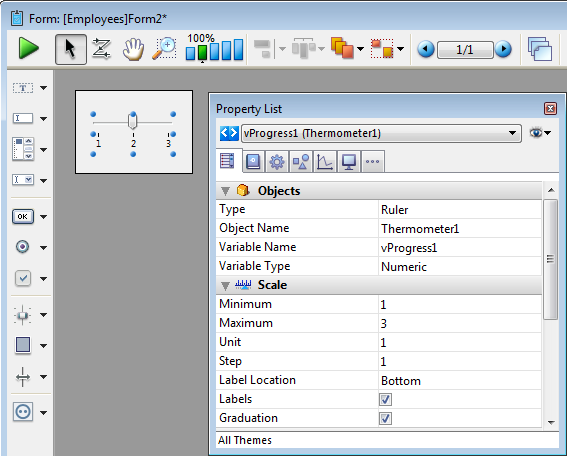 Adiciona uma régua horizontal graduada a uma variável número cujos valores pré-determinados min e max são 0 e 100. Pode modificar estes valores utilizando a lista de propriedades.