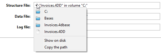 ウィンドウの中央部は、データペースストラクチャーならびにデータファイルとログファイル(あれば)の名前および場所を表示します。ウィンドウの下部は、4D ライセンスフォルダーの名前、ライセンスのタイプ、およびパスワードが有効化されている時のデータベースユーザの名前 (有効でない場合はDesigner) を表示します。