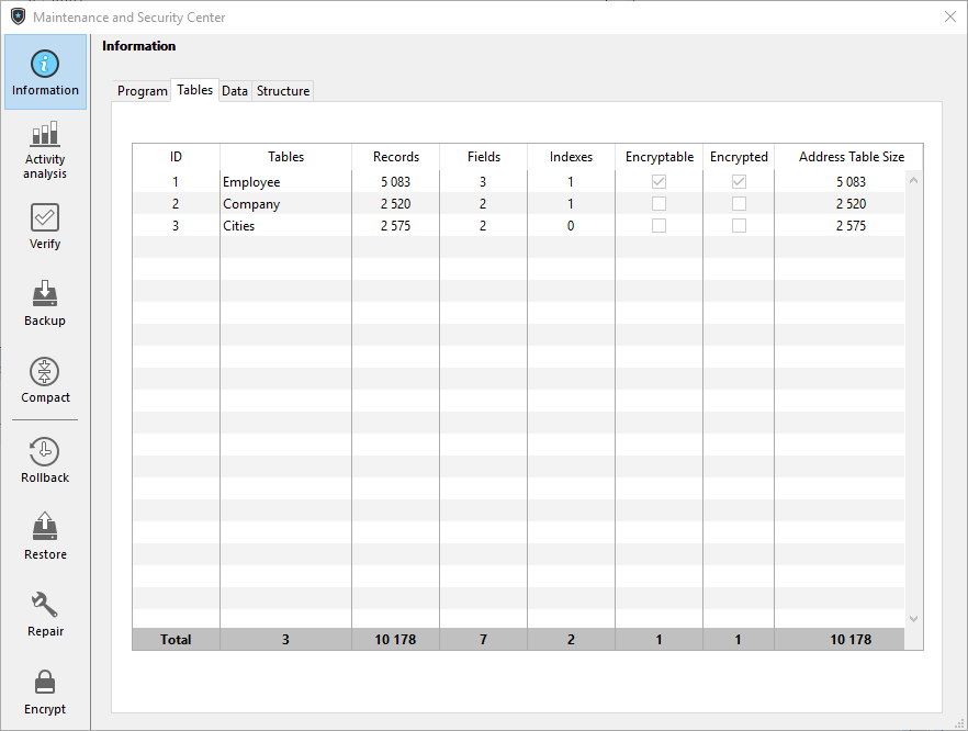 • アドレステーブルサイズ: 各テーブルのアドレスサイズ。アドレステーブルとはテーブル内で作成される各レコードにつき要素が一つ保存される内部テーブルの事です。これはレコードとその物理アドレスをつなげる働きをします。パフォーマンス上の理由から、レコードが削除されてもリサイズはされず、そのためそのサイズはテーブル内のカレントレコード数とは異なる場合があります。この差異が著しく大きい場合、"アドレステーブルを圧縮"オプションをチェックした状態でデータ圧縮を実行することで、アドレステーブルサイズを最適化することができます(圧縮ページを参照してください)。
