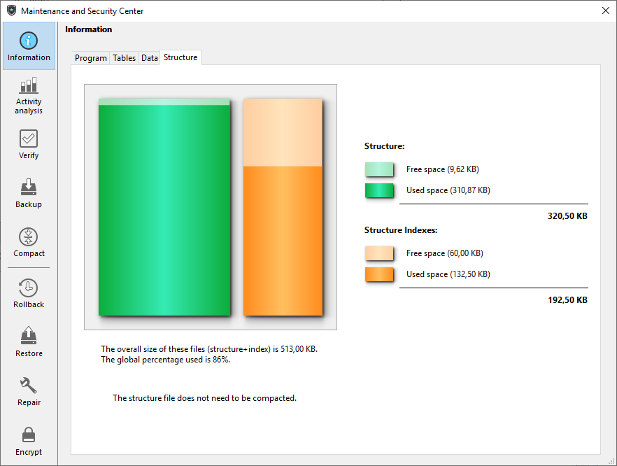 データおよびストラクチャーページにはデータベースストラクチャーファイルとデータファイルの、利用可能サイズと使用済みサイズの容量の情報が表示されます。