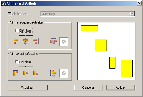 Pode pré-visualizar o resultado de seus parâmetros clicando no botão Visualizar: a caixa de diálogo Alinhar e distribuir fica em primeiro plano e o editor de formulários mostra os objetos alinhados e distribuídos. Apenas pode Cancelar ou Aplicar as mudanças.