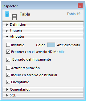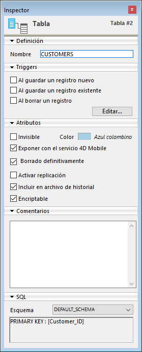 Las propiedades de los objetos del editor de estructura (tablas, campos y relaciones) pueden visualizarse y modificarse vía la paleta del Inspector: