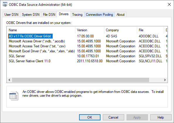 Windows 用のODBC ドライバーは4D のWebサイトからダウンロードすることができます: