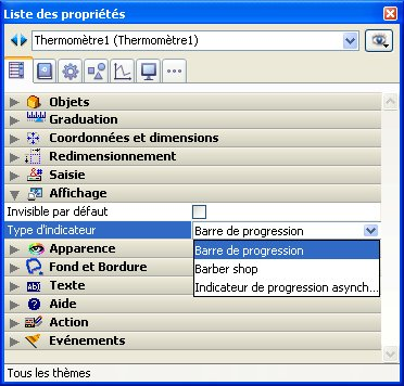 Pour les indicateurs de progression, ces variantes sont définies via la propriété Type d'indicateur du thème "Affichage" de la Liste des propriétés :