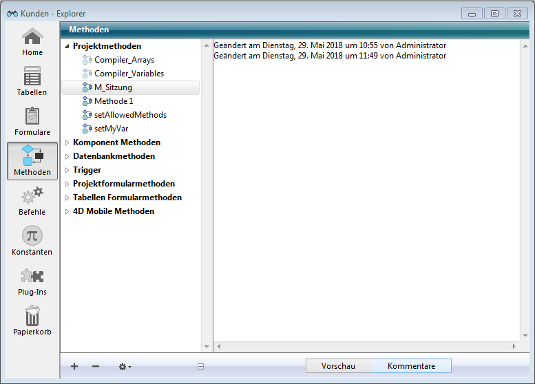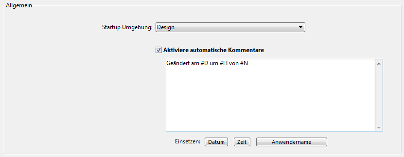 Für Methoden und Formulare der Datenbank können Sie ein automatisches Kommentarsystem aktivieren. Ist dieses System aktiv, wird jeder Methode bzw. jedem Formular, das in der Datenbank erstellt oder geändert wird, automatisch ein Kommentar zugeordnet. Das können statischer Text sein, z.B. „Geändert von“ oder Variablen, z.B. aktuelles Datum, aktueller Benutzername (wie im 4D Kennwortsystem festgelegt).