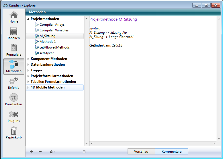 Hinweis zur Kompatibilität: Ab 4D Version 12 erscheinen Kommentare, die im Kopfteil der Methode mit den Zeichen // eingefügt wurden, als Hilfetipps, wenn in einer anderen Methode auf diese Methode verwiesen wird (siehe Abschnitt "Hilfetipps verwenden" unter WA SET EXTERNAL LINKS FILTERS). Diese Funktionalität ist besonders hilfreich zum Dokumentieren von Benutzermethoden. Sie ist jedoch nicht kompatibel mit Kommentaren, die im Explorer gesetzt werden. Wollen Sie Kopfteile von Methoden auf diese Weise verwenden, geben Sie keine Kommentare im Explorer ein.
