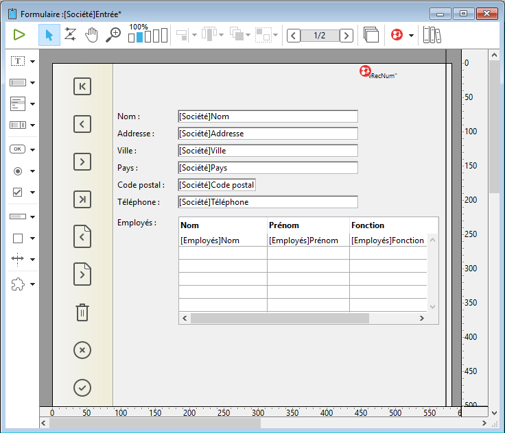 Affichage et gestion des pages : cette zone permet de passer d’une page du formulaire à une autre et d’ajouter des pages. Pour naviguer parmi les pages du formulaire, cliquez sur les boutons fléchés ou cliquez sur la zone centrale et choisissez la page à afficher dans le menu qui apparaît. Si vous cliquez sur le bouton fléché de droite alors que vous êtes sur la dernière page du formulaire, 4D vous permet d’ajouter une page. Pour plus d’informations sur ce point, reportez-vous à la section Définir un formulaire multi-pages.