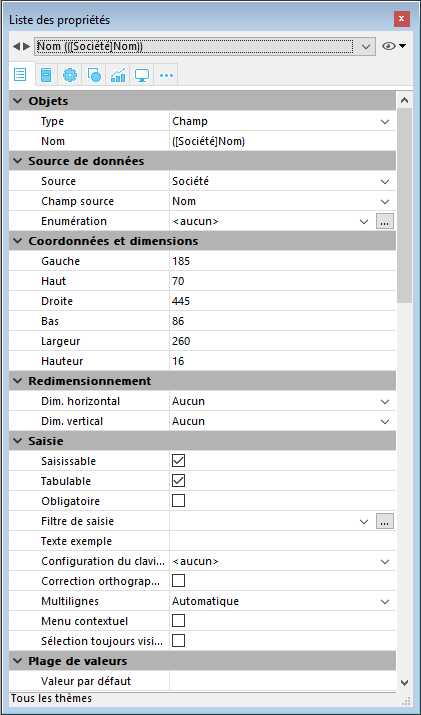 Valeur : regroupe les propriétés définissant l’édition et l’affichage des objets saisissables (saisissable, équivalent clavier, format d’affichage, etc.).