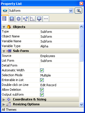 プロパティリストのサブフォームテーマで、出力サブフォームオプションがチェックされていることを確認し、ソースメニューからソーステーブルを選択したらリストフォームから使用するフォームを選択します。