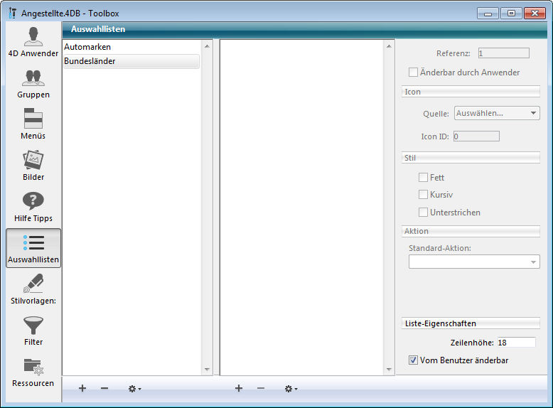 Wählen Sie im Menü Design den Befehl Toolbox und klicken am linken Rand auf den Icon Auswahllisten. Der Listeneditor wird geöffnet; standardmäßig ist er leer: