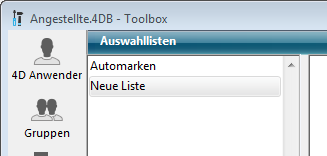 Klicken Sie unter den Auswahllisten auf das Pluszeichen ODER Klicken Sie mit der rechten Maustaste in die Auswahllisten und wählen im Kontextmenü den Eintrag Neu. 4D erzeugt im Bereich Auswahllisten ein neues Element mit Namen Neue Liste N. Hinweis: Gibt es bereits eine Auswahlliste im linken Bereich, ist im Kontextmenü der Befehl Duplizieren verfügbar. Damit können Sie rasch eine neue Auswahlliste mit den Eigenschaften der bereits bestehenden Liste erzeugen.