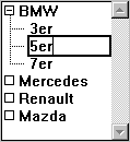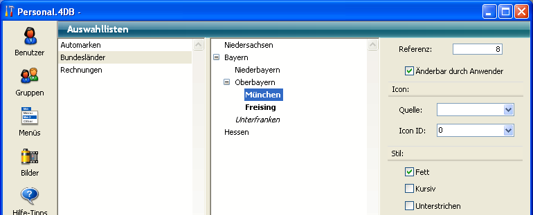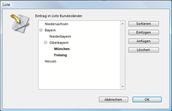 Eine Liste kann auch hierarchisch aufgebaut sein. In diesem Fall können Sie für jeden einzelnen Eintrag festlegen, ob der Benutzer ihn bearbeiten kann. Ist ein Listeneintrag änderbar, kann er per Doppelklick oder unter Windows bei gedrückter Alt-Taste, auf Mac OS bei gedrückter Wahltaste auf den Eintrag klicken und ihn ändern. Hierzu ein Beispiel: