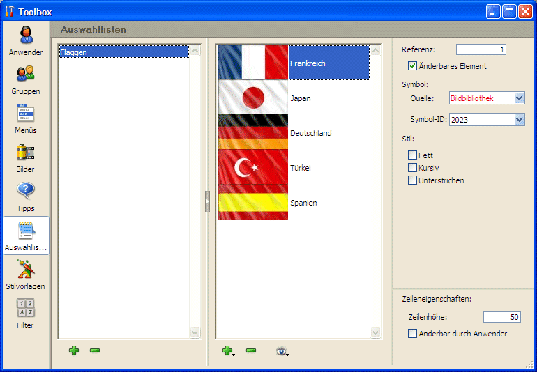 Sie können festlegen, ob eine Auswahlliste durch den Benutzer änderbar ist. Eine Liste ist standardmäßig nicht änderbar.