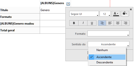 Pode especificar uma ordem a qualquer momento usando a janela de popup associada com o cabeçalho da coluna. Pode escolher uma ordem ascendente ou descendente usando o menu Sort Order/ Escolher Ordem: