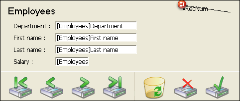 プロジェクトフォームは主にDIALOGコマンドのコンテキストで使用されることを想定しているため、(次レコードやレコード削除など) レコード管理の標準アクションボタンは、デフォルトではエディターやフォームウィザードに配置されません。レコードの表示やデータの変更はランゲージコマンドを使用して開発者が管理します。