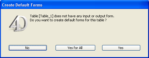 テーブルのフォームを作成せずにレコードの表示を行おうとすると、4Dはデフォルトの入力フォームと出力フォームを作成するかどうかを尋ねてきます (これを行わないように設定することもできます)。