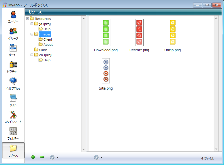 リソースエクスプローラーにはカレントデータベースのResourcesフォルダーの内容が階層リストで表示されます。またフォルダーの内容の管理を容易にするための追加の機能 (項目の追加や削除、プレビューなど) が複数用意されています。