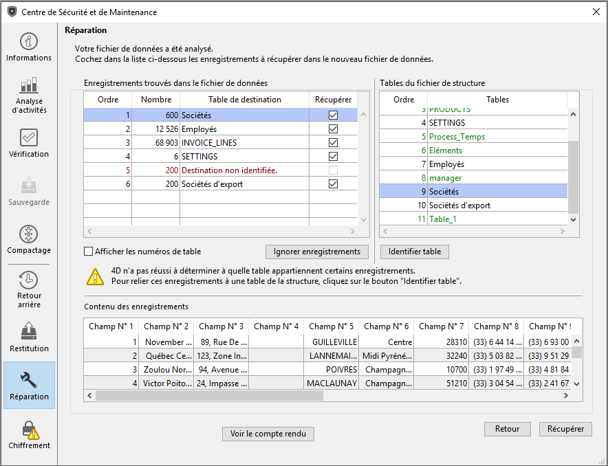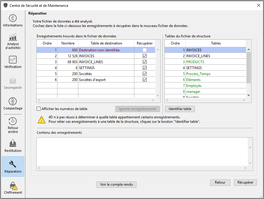 Une fois que vous avez configuré les éléments à récupérer, cliquez sur le bouton Réparer ou Analyser et réparer... selon l'option choisie, afin de lancer la réparation. Si vous avez choisi la récupération par en-têtes d'enregistrements, une boîte de dialogue intermédiaire vous permettra de sélectionner les éléments à récupérer (cf. Réparation par en-têtes d'enregistrements ci-dessous).