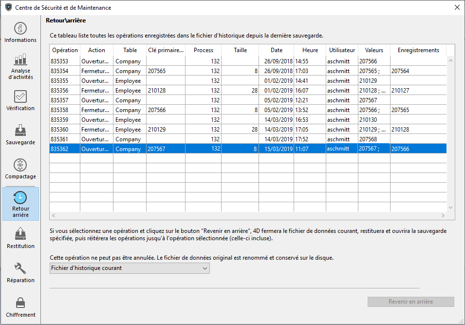 Si vous cliquez sur OK, les données sont alors restituées dans l’état exact où elles se trouvaient au moment de l’action sélectionnée. Le menu situé en bas de la fenêtre vous permet de sélectionner le fichier d’historique à utiliser lorsque vous appliquez la fonction de retour en arrière à une base restituée. Dans ce cas, vous devez désigner le fichier d’historique correspondant à l’archive.