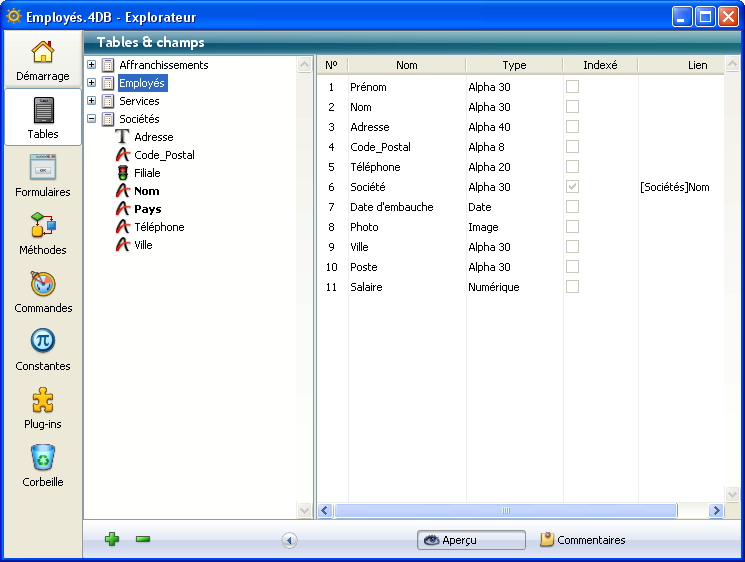 En plus des numéros, noms et types des champs de la table sélectionnée, le tableau liste les index associés à la table (quel que soit leur type) ainsi que les liens partant de la table. Pour chaque champ d’où part un lien (champ N), le champ d’arrivée du lien (champ 1) est indiqué dans la colonne Lien.