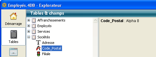 Vous pouvez ajouter un champ dans un formulaire en le faisant glisser depuis la page Tables de l’Explorateur. Vous pouvez aussi ajouter un nom de table ou de champ dans une méthode en le faisant glisser dans la fenêtre de l’éditeur de méthodes. Lorsque vous procédez de cette manière, le nom apparaît en accord avec la syntaxe. Par exemple, si vous faites glisser le champ “Prénom” d’une table [Clients], il apparaît dans la méthode sous la forme “[Clients]Prénom”.