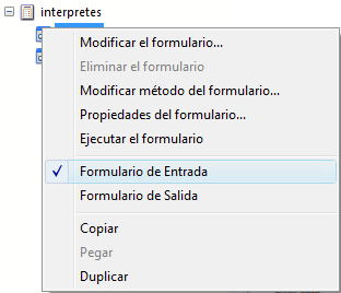 Puede designar los formularios de entrada y de salida actuales para cada tabla desde el Explorador (formularios tabla únicamente). Para hacerlo, haga clic en el nombre del formulario tabla y utilice los comandos Formulario de entrada o Formulario de salida del menú contextual: