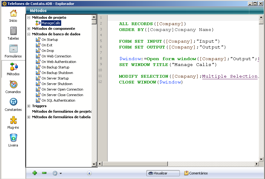 A página Métodos mostra as listas de métodos de projeto, métodos de banco de dados, métodos formulário tabela, métodos formulários projeto e triggers do banco de dados. Os tipos de métodos se agrupam por categorias.