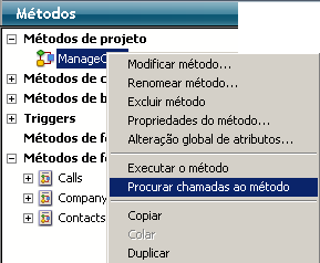 Pode pesquisar no Explorador a lista de objetos que fazem referência a um método de projeto (outros métodos ou menus). Esta função está disponível através do comando Pesquisar chamadas ao método no menu contextual ou no menu opções da página: