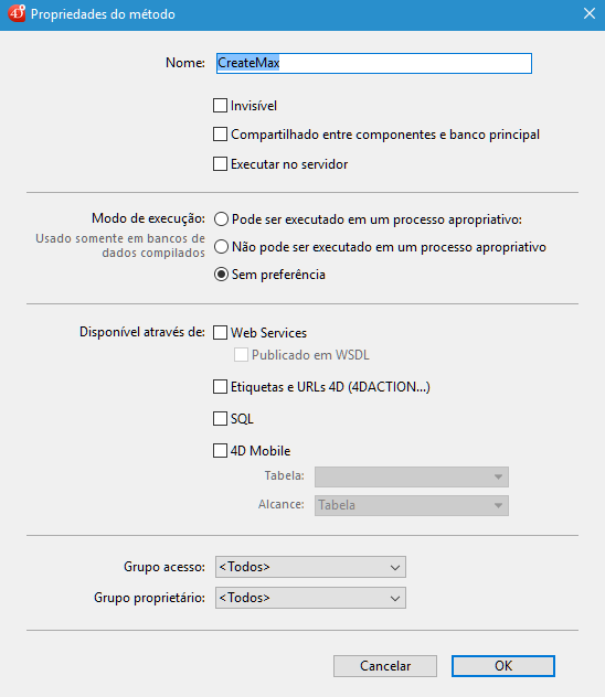 O comando Alteração global de atributos... do menu contextual ou do menu opções (apenas se aplica a métodos projeto) permite modificar em una mesma operação um atributo (Invisível, Disponível através de 4DACTION, 4DMETHOD e 4DSCRIPT, etc.) para todos ou alguns dos métodos projeto do banco. Para mais informação, consulte o parágrafo “Alteração global de atributos de métodos”, na seção Alteração global de atributos de métodos.