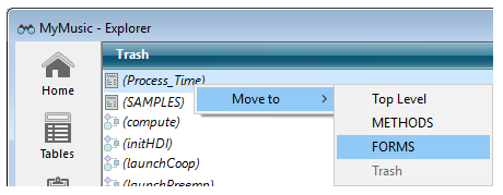 También puede poner una tabla en la Papelera. La tabla desaparece de los editores de la base, incluyendo el editor de Estructura. Cuando pone una tabla en la Papelera, los formularios de la tabla se eliminan automáticamente (pasan a la Papelera) y sus menús asociados se borran.