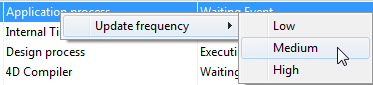 Pode modificar a frequência com a qual atualizar a informação, que pode ser a cada um, dois ou três segundos. Escolha um valor no menu "Frequência de atualização" localizado na parte inferior da janela. Quanto maior o tempo de atualização, mais tempo de CPU é consumido pelo Explorador de Execução. O número de processos a serem representados graficamente na tela também influencia o tempo de CPU consumido pelo processo.