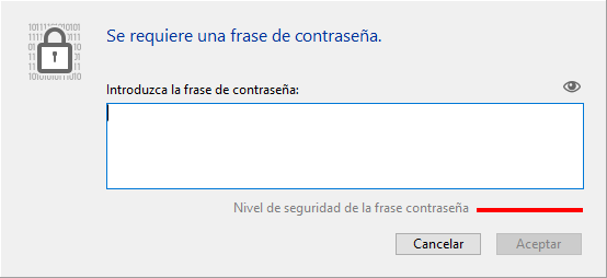 Ingrese la nueva frase de contraseña (para mayor seguridad, se le solicitará que la ingrese dos veces): El archivo de datos se cifra con la nueva llave y se muestra un mensaje de confirmación.