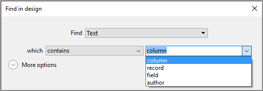 contains: Searches all text in the Design environment for the specified string. Search results for "var" can include "myvar", "variable1" or "aVariable".