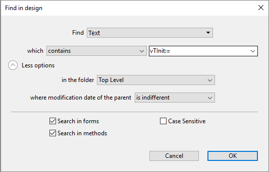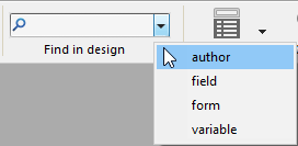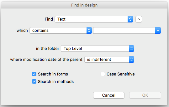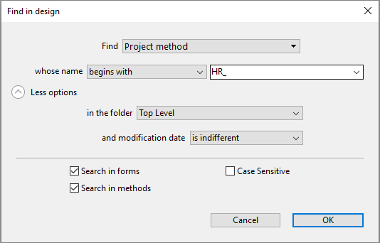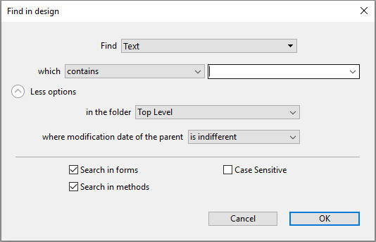 Click on the Search button () in the 4D toolbar. OR Select the Find in Design... command from the Edit menu. The "Find in design" window appears: The areas of this window vary dynamically depending on the selections made in the menus. You can expand this window so that all options are visible: