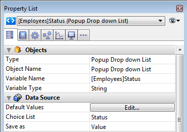 - プロパティリストでデフォルト値のリストを入力します。これを行うには、プロパティリストのデータソーステーマにおいて”デフォルト値”フィールドの編集...ボタンをクリックします。詳細についてはデフォルト値のリストを参照してください。このデフォルト値は、配列へ自動的にロードされます。オブジェクトに関連付けた変数名を使用して、この配列を参照することができます。