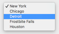 フォームを実行すると、4D が自動的に入力と表示中のポップアップメニュー/コンボボックスの状態を管理してくれます。ユーザーが値を選択すると、その値はフィールドに保存され、このフィールドの値はフォームが表示されたときにポップアップメニューの中に表示されます: