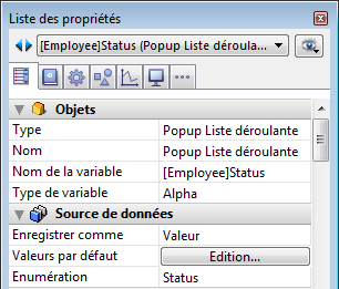 Lorsque vous avez associé un objet pop-up/liste déroulante à une liste de choix (énumération) et à un champ, vous pouvez utiliser l'option Enregistrer comme Valeur/Référence dans le thème "Sources de données" de la Liste des propriétés.