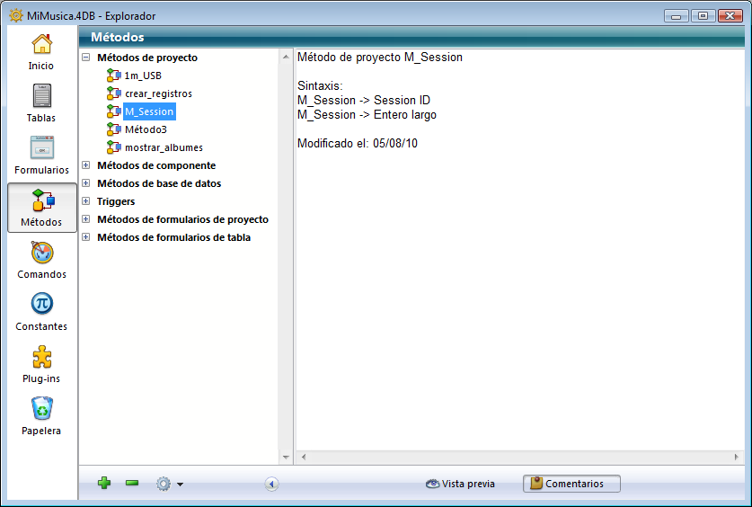 . La ventana de vista previa le permite visualizar las tablas y campos, los formularios, los métodos, la documentación de los comandos, los valores de constantes, así como también la información sobre los componentes y plug-ins instalados en la base. También puede utilizar el área de vista previa para añadir y ver comentarios sobre ciertos objetos de la base.