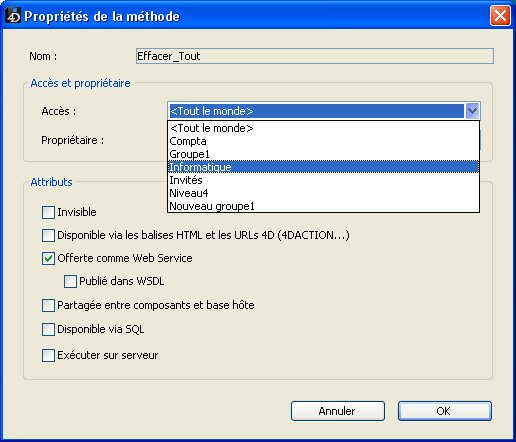 L’exemple suivant représente l’affectation du privilège "Accès” de la méthode projet Effacer_Tout à un groupe. Les groupes peuvent généralement se voir affecter comme privilèges “Accès” (utilisation) et/ou “Propriétaire” (modification).