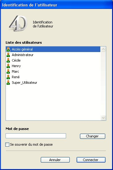 Pour ouvrir une base de données, un utilisateur saisit son nom ou le sélectionne dans la liste des utilisateurs puis saisit son mot de passe. Ensuite, en fonction des groupes auxquels il appartient ainsi que des privilèges de ces groupes, l’utilisateur peut accéder aux parties de la base de données qui ont été spécifiées dans le système d’accès.