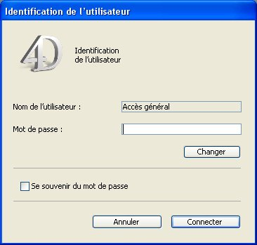 - Si vous avez défini un Utilisateur par défaut dans les Propriétés de la base et lui avez associé un mot de passe, la boîte de dialogue suivante est affichée :