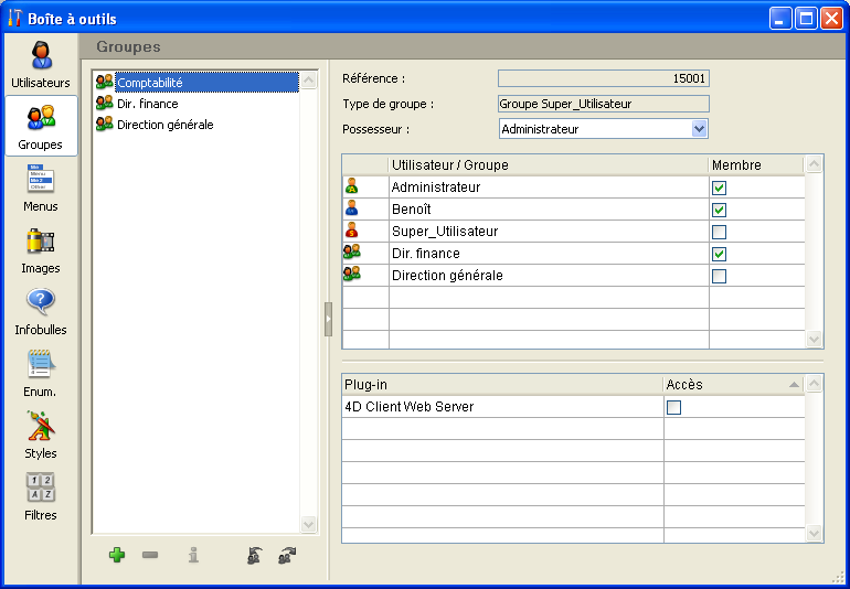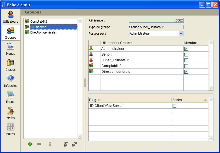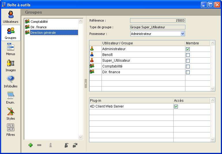 - Le groupe Direction générale ne contient que les utilisateurs de “haut niveau”.