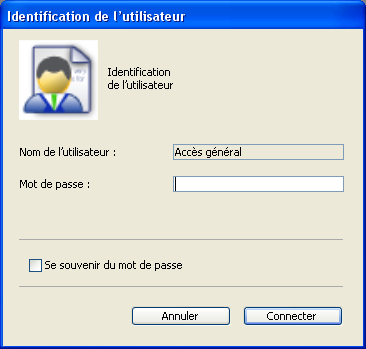 Les utilisateurs n’ont alors qu’à saisir un mot de passe. - Si vous n’avez pas associé de mot de passe à l’utilisateur par défaut, aucune boîte de dialogue n’apparaît. Chaque utilisateur dispose dans ce cas des privilèges et restrictions d’accès qui ont été assignés à l’utilisateur par défaut.