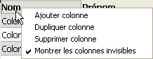 Une list box contient une ou plusieurs colonnes dont le contenu est automatiquement synchronisé. Par défaut lorsque vous créez une list box, elle contient une seule colonne. Vous pouvez modifier le nombre de colonnes (ajouter, dupliquer ou supprimer une colonne) à l’aide du menu contextuel (clic sur une colonne ou un en-tête de colonne) ou dans les propriétés de la list box.