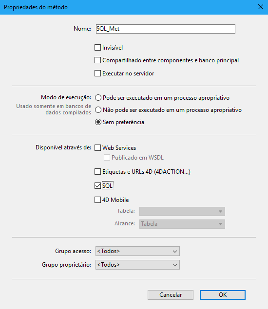 End SQLUma propriedade de segurança foi adicionada para os métodos projeto 4D: Disponível via SQL: